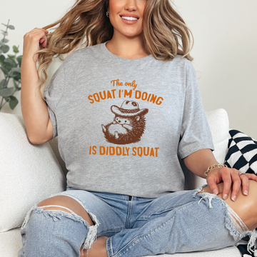 Introducing the Diddly Squat Tee! This relaxed fit short sleeve tee features an adorable hedgehog graphic and the playful phrase "The Only Squat I'm Doing Is Diddly Squat."