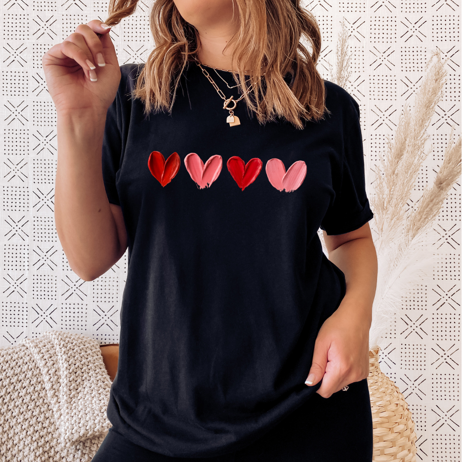 The Painted Hearts design—four textured, paint-style hearts in a row—adds just enough artsy flair to elevate your everyday outfit. Crafted from our soft yet durable cotton-poly blend, this tee feels smooth on the skin, holds its shape, and hits just right at the hip. Easy to style, easy to wash, and easy to love.